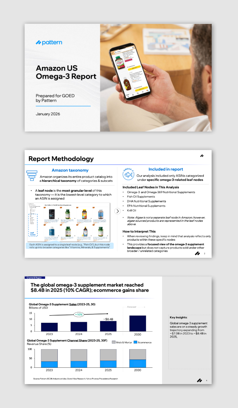 GOED partner Pattern has released a new report analyzing the global omega-3 supplements market, with a deep dive into Amazon US performance and consumer behavior. The report shows the category reached US$8.4B (€7.1B) globally in 2025, with e-commerce continuing to gain share—and Amazon US alone now representing an estimated US$674M (€573.9M) and growing 18% year over year.